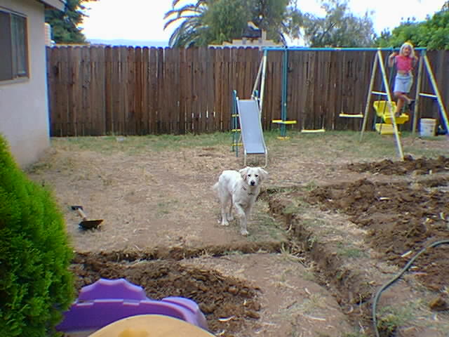 The back yard still looks like this. I started to put in sprinklers but had to stop to put a room in the garage. Hopefully by next summer, the backyard will be really nice.... (the dog in the picture was a failed attempt to get a new dog in the family, way too much puppy!!!).